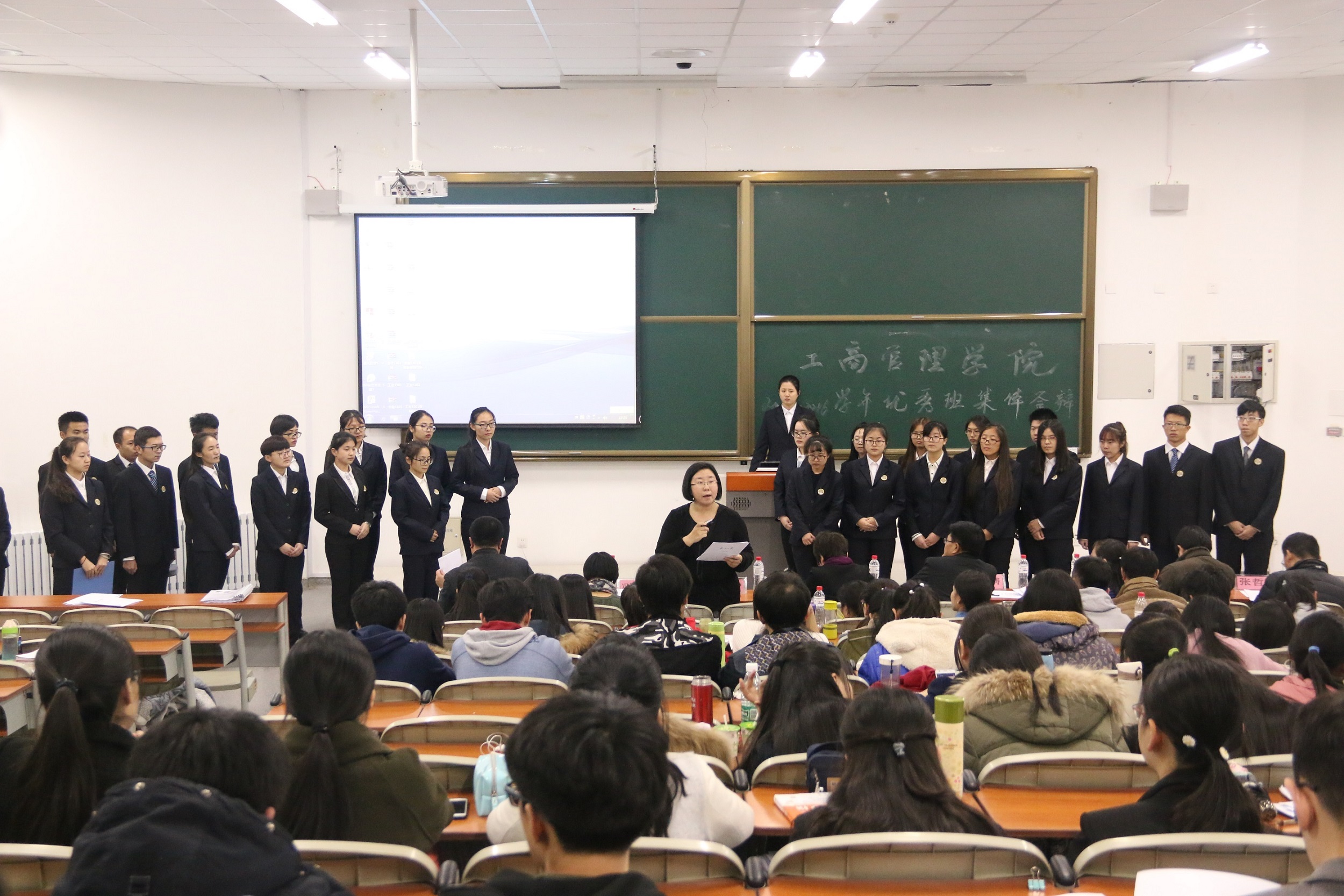 活动开始,主持人播放了2015-2016学年学院班集体建设汇报视频。随后,各班级代表分别从班风建设、寝室建设、文体活动、党团工作等方面介绍了在上一学年中所取得的优异成绩,突显了管理学院各班级的特色。其中会计1301班的展示独具风采,进步显著;金融1401班全面发展,各方面都取得了较好成绩;经济1501班在民族生工作及特色班级文化建设方面取得的成绩也得到了评委们的一致认同。在评委提问过程中,各班代表思维敏捷,他们的精彩答辩也赢得了在场观众的阵阵掌声。