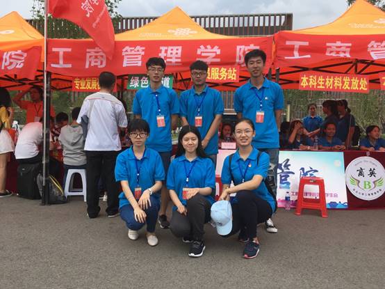 8月26日下午,尽管烈日高照,党员志愿者已经在管理学院迎新接待站上岗,提前迎接2017级新生。迎新接待处”爱在管院“的宣传标语,让新生在刚一到校就感受到管院的关怀。