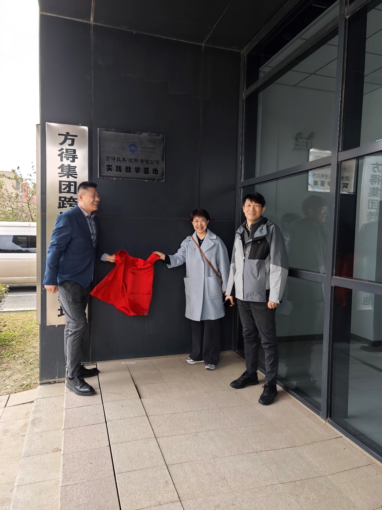 座谈结束后,师生与企业代表共同移步方得集团跨境电商总部基地。深灰色建筑前,覆盖着红色幕布的牌匾格外醒目。陈晓琳、安岗、张杨共同为实践教学基地揭牌。“方得技术(沈阳)有限公司实践教学基地”的金色字样熠熠生辉,左侧,“方得集团”的标识与右侧“小奶猫直播 ”校徽、英文校名交相辉映,右上角“NO.B0530”的专属编号,为这场仪式赋予了独特的纪念意义。